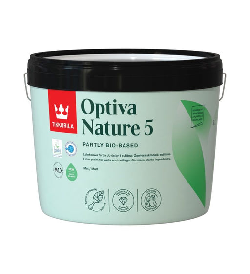 TikkurilaOptiva Nature Matt (5) is a durable, scrub-resistant matt paint with 5% sheen, designed for interior walls. It contains 30% plant-based ingred...